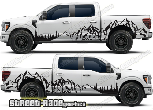 Ford F-150 side graphics. They are shown on the 14th generation dual cab F-150 XLT, but they can be trimmed to fit all cab versions (single, crew and double cab) and facelift variants. The graphics will also fit other F-Series trucks (F-250 & F-350) and earlier versions (12th & 13th gen).
