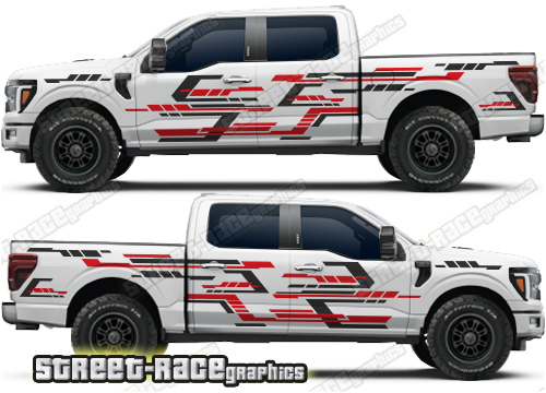 Ford F-150 side graphics. They are shown on the 14th generation dual cab F-150 XLT, but they can be trimmed to fit all cab versions (single, crew and double cab) and facelift variants. The graphics will also fit other F-Series trucks (F-250 & F-350) and earlier versions (12th & 13th gen).
