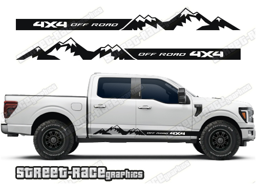 Ford F-150 side graphics. They are shown on the 14th generation dual cab F-150 XLT, but they can be trimmed to fit all cab versions (single, crew and double cab) and facelift variants. The graphics will also fit other F-Series trucks (F-250 & F-350) and earlier versions (12th & 13th gen).