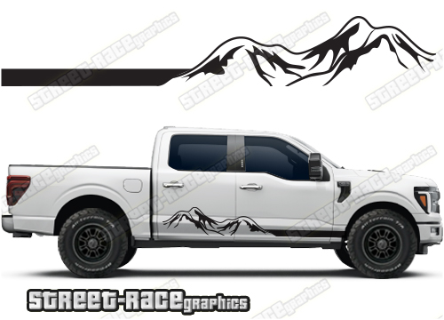 Ford F-150 side graphics. They are shown on the 14th generation dual cab F-150 XLT, but they can be trimmed to fit all cab versions (single, crew and double cab) and facelift variants. The graphics will also fit other F-Series trucks (F-250 & F-350) and earlier versions (12th & 13th gen).