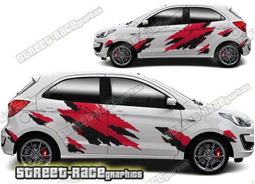 Ford Ka large graphics. They are a universal fit to suit all Ford Ka cars and facelift variants. There are no cutouts for the door handles, wheel arches or door lines; these will require trimming during fitting.
