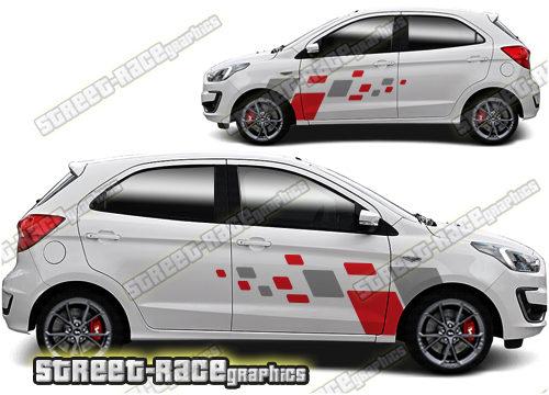 Ford Ka large graphics. They are a universal fit to suit all Ford Ka cars and facelift variants. There are no cutouts for the door handles, wheel arches or door lines; these will require trimming during fitting.