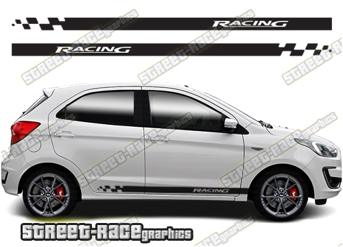 Ford Ka racing stripes. They are a universal fit to suit all Ford Ka cars and facelift variants from MK1 onwards. There are no cutouts for the wheel arches or door lines; these will require trimming during fitting.