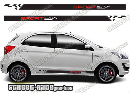 Ford Ka racing stripes. They are a universal fit to suit all Ford Ka cars and facelift variants from MK1 onwards. There are no cutouts for the wheel arches or door lines; these will require trimming during fitting.
