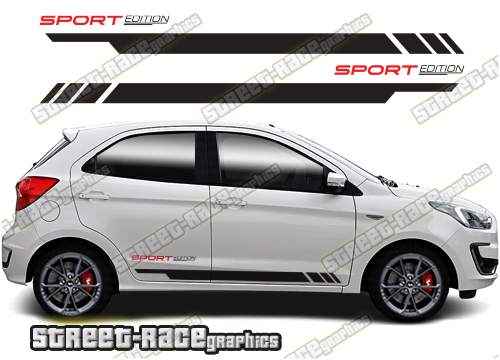 Ford Ka racing stripes. They are a universal fit to suit all Ford Ka cars and facelift variants from MK1 onwards. There are no cutouts for the wheel arches or door lines; these will require trimming during fitting.