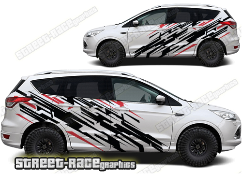 Ford Kuga graphics. They are shown on the second generation Kuga but they can be trimmed to fit all later versions and facelift variants. The decals are not pre-cut for any specific Ford Kuga version; they do not have any door handle cutouts, wheel arch or door line splits. These will require trimming during fitting. Vinyl will not stick to unpainted textured plastics.