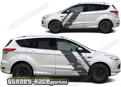 Ford Kuga graphics. They are shown on the second generation Kuga but they can be trimmed to fit all later versions and facelift variants. The decals are not pre-cut for any specific Ford Kuga version; they do not have any door handle cutouts, wheel arch or door line splits. These will require trimming during fitting. Vinyl will not stick to unpainted textured plastics.