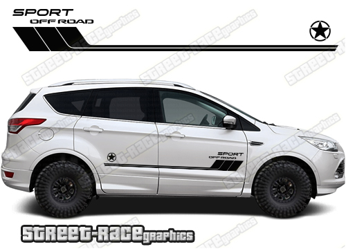 Ford Kuga racing stripes. They are shown on the second generation Kuga but they can be trimmed to fit all later versions and facelift variants. The decals are not pre-cut for any specific Ford Kuga version; they do not have any door handle cutouts, wheel arch or door line splits. These will require trimming during fitting. Vinyl will not stick to unpainted textured plastics.