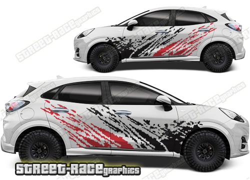 Ford Puma graphics. They are shown on the first generation Puma but they can be trimmed to fit all later versions and facelift variants. The decals are not pre-cut for any specific Ford Puma version; they do not have any door handle cutouts, wheel arch or door line splits. These will require trimming during fitting. Vinyl will not stick to unpainted textured plastics.