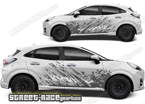 Ford Puma graphics. They are shown on the first generation Puma but they can be trimmed to fit all later versions and facelift variants. The decals are not pre-cut for any specific Ford Puma version; they do not have any door handle cutouts, wheel arch or door line splits. These will require trimming during fitting. Vinyl will not stick to unpainted textured plastics.