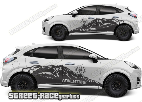 Ford Puma graphics. They are shown on the first generation Puma but they can be trimmed to fit all later versions and facelift variants. The decals are not pre-cut for any specific Ford Puma version; they do not have any door handle cutouts, wheel arch or door line splits. These will require trimming during fitting. Vinyl will not stick to unpainted textured plastics.