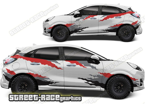 Ford Puma graphics. They are shown on the first generation Puma but they can be trimmed to fit all later versions and facelift variants. The decals are not pre-cut for any specific Ford Puma version; they do not have any door handle cutouts, wheel arch or door line splits. These will require trimming during fitting. Vinyl will not stick to unpainted textured plastics.