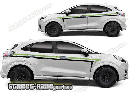 Ford Puma graphics. They are shown on the first generation Puma but they can be trimmed to fit all later versions and facelift variants. The decals are not pre-cut for any specific Ford Puma version; they do not have any door handle cutouts, wheel arch or door line splits. These will require trimming during fitting. Vinyl will not stick to unpainted textured plastics.