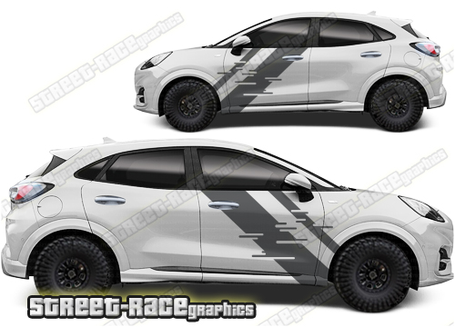 Ford Puma graphics. They are shown on the first generation Puma but they can be trimmed to fit all later versions and facelift variants. The decals are not pre-cut for any specific Ford Puma version; they do not have any door handle cutouts, wheel arch or door line splits. These will require trimming during fitting. Vinyl will not stick to unpainted textured plastics.