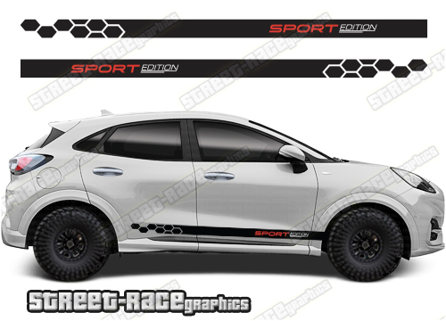 Ford Puma racing stripes. They are shown on the first generation Puma but they can be trimmed to fit all later versions and facelift variants. The decals are not pre-cut for any specific Ford Puma version; they do not have any door handle cutouts, wheel arch or door line splits. These will require trimming during fitting. Vinyl will not stick to unpainted textured plastics.