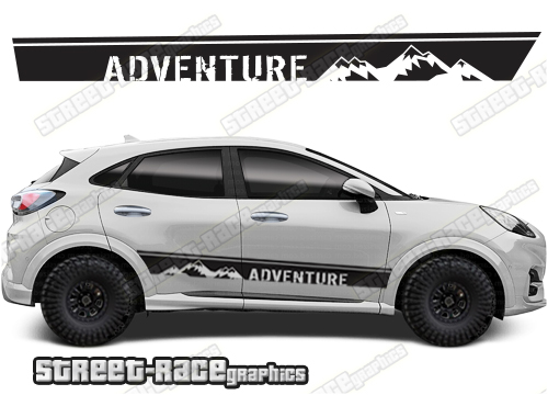 Ford Puma racing stripes. They are shown on the first generation Puma but they can be trimmed to fit all later versions and facelift variants. The decals are not pre-cut for any specific Ford Puma version; they do not have any door handle cutouts, wheel arch or door line splits. These will require trimming during fitting. Vinyl will not stick to unpainted textured plastics.