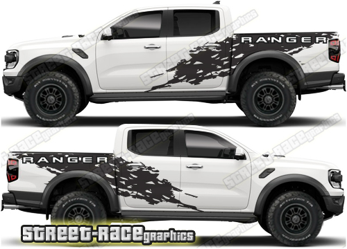 Ford Ranger large graphics. They are shown on the 4th generation dual cab, but they can be trimmed to fit all cab versions (single, crew and double cab) and facelift variants. The decals do not have any door handle cutouts, wheel arch or door line splits. These will require trimming during fitting.
