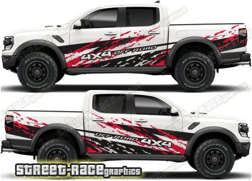Ford Ranger large graphics. They are shown on the 4th generation dual cab, but they can be trimmed to fit all cab versions (single, crew and double cab) and facelift variants. The decals do not have any door handle cutouts, wheel arch or door line splits. These will require trimming during fitting. Vinyl will not stick to textured surfaces such as unpainted wheel arch flares or raptor paint.