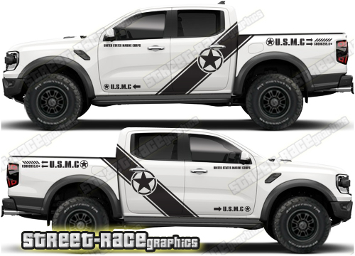 Ford Ranger large graphics. They are shown on the 4th generation dual cab, but they can be trimmed to fit all cab versions (single, crew and double cab) and facelift variants. The decals do not have any door handle cutouts, wheel arch or door line splits. These will require trimming during fitting. Vinyl will not stick to textured surfaces such as unpainted wheel arch flares or raptor paint.