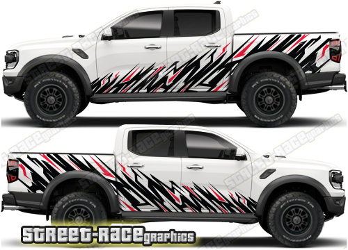 Ford Ranger large graphics. They are shown on the 4th generation dual cab, but they can be trimmed to fit all cab versions (single, crew and double cab) and facelift variants. The decals do not have any door handle cutouts, wheel arch or door line splits. These will require trimming during fitting. Vinyl will not stick to textured surfaces such as unpainted wheel arch flares or raptor paint.