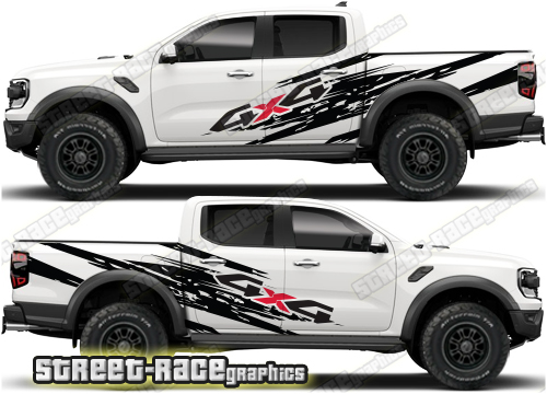Ford Ranger large graphics. They are shown on the 4th generation dual cab, but they can be trimmed to fit all cab versions (single, crew and double cab) and facelift variants. The decals do not have any door handle cutouts, wheel arch or door line splits. These will require trimming during fitting. Vinyl will not stick to textured surfaces such as unpainted wheel arch flares or raptor paint.