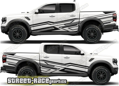 Ford Ranger large graphics. They are shown on the 4th generation dual cab, but they can be trimmed to fit all cab versions (single, crew and double cab) and facelift variants. The decals do not have any door handle cutouts, wheel arch or door line splits. These will require trimming during fitting. Vinyl will not stick to textured surfaces such as unpainted wheel arch flares or raptor paint.