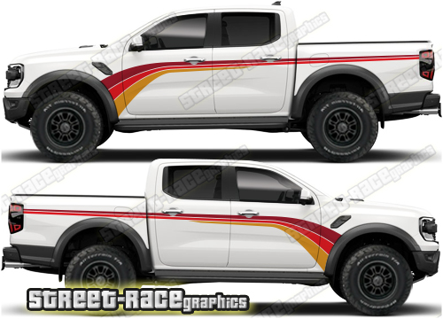 Ford Ranger large graphics. They are shown on the 4th generation dual cab, but they can be trimmed to fit all cab versions (single, crew and double cab) and facelift variants. The decals do not have any door handle cutouts, wheel arch or door line splits. These will require trimming during fitting. Vinyl will not stick to textured surfaces such as unpainted wheel arch flares or raptor paint.