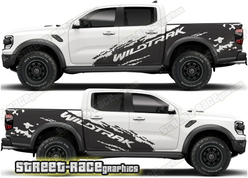 Ford Ranger Wildtrak large graphics. They are shown on the 4th generation dual cab, but they can be trimmed to fit all cab versions (single, crew and double cab) and facelift variants. The decals do not have any door handle cutouts, wheel arch or door line splits. These will require trimming during fitting. Vinyl will not stick to textured surfaces such as unpainted wheel arch flares or raptor paint.