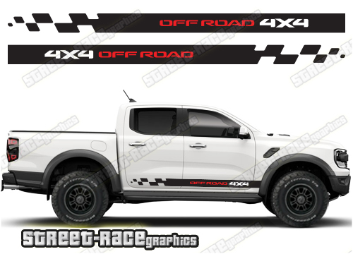 Ford Ranger side graphics. They are shown on the 4th generation dual cab, but they can be trimmed to fit all cab versions (single, crew and double cab) and facelift variants. Vinyl will not stick to textured surfaces such as unpainted wheel arch flares or raptor paint.