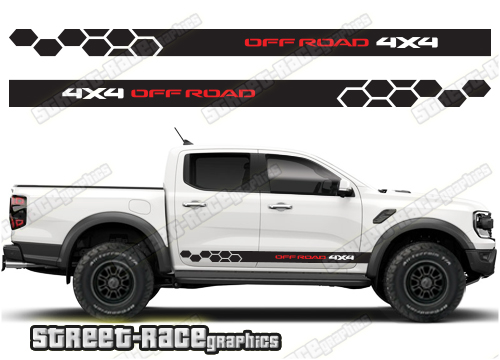 Ford Ranger side graphics. They are shown on the 4th generation dual cab, but they can be trimmed to fit all cab versions (single, crew and double cab) and facelift variants. Vinyl will not stick to textured surfaces such as unpainted wheel arch flares or raptor paint.