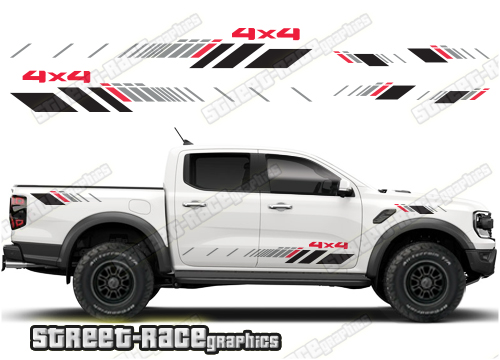 Ford Ranger side graphics. They are shown on the 4th generation dual cab, but they can be trimmed to fit all cab versions (single, crew and double cab) and facelift variants. Vinyl will not stick to textured surfaces such as unpainted wheel arch flares or raptor paint.