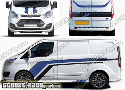 Ford Transit Custom M-SPORT style racing stripes sticker kit from street race graphics. Included are side stripes, front bumper & bonnet graphics, plus stripes for the rear doors. This kit will fit all versions of the Transit Custom.