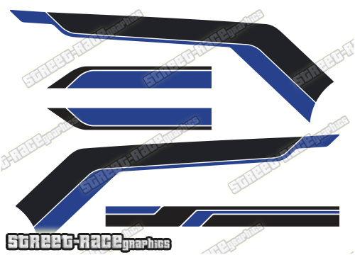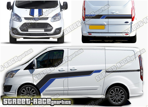 Ford Transit Custom M-SPORT style racing stripes sticker kit from street race graphics. Included are side stripes, front bumper & bonnet graphics, plus stripes for the rear doors. This kit will fit all versions of the Transit Custom.