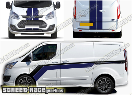 Ford Transit Custom M-SPORT style racing stripes sticker kit from street race graphics. Included are side stripes, front bumper & bonnet graphics, plus stripes for the rear doors. This kit will fit all versions of the Transit Custom.