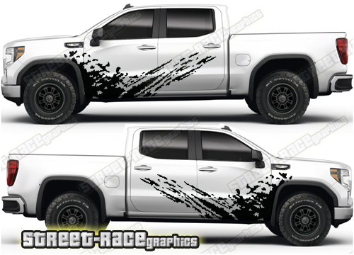 GMC Sierra large graphics. They are shown on the 4th generation dual cab 1500 GMC Sierra, but they can be trimmed to fit all earlier versions and facelift variants. The decals do not have any door handle cutouts, wheel arch or door line splits. These will require trimming during fitting. Vinyl will not stick to unpainted textured plastics.