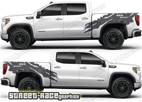 GMC Sierra large graphics. They are shown on the 4th generation dual cab 1500 GMC Sierra, but they can be trimmed to fit all earlier versions and facelift variants. The decals do not have any door handle cutouts, wheel arch or door line splits. These will require trimming during fitting. Vinyl will not stick to unpainted textured plastics.