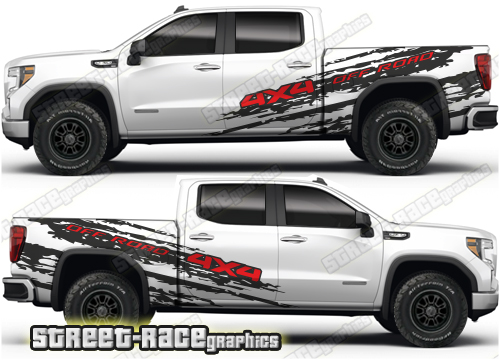 GMC Sierra large graphics. They are shown on the 4th generation dual cab 1500 GMC Sierra, but they can be trimmed to fit all earlier versions and facelift variants. The decals do not have any door handle cutouts, wheel arch or door line splits. These will require trimming during fitting. Vinyl will not stick to unpainted textured plastics.