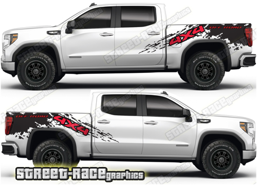GMC Sierra large graphics. They are shown on the 4th generation dual cab 1500 GMC Sierra, but they can be trimmed to fit all earlier versions and facelift variants. The decals do not have any door handle cutouts, wheel arch or door line splits. These will require trimming during fitting. Vinyl will not stick to unpainted textured plastics.