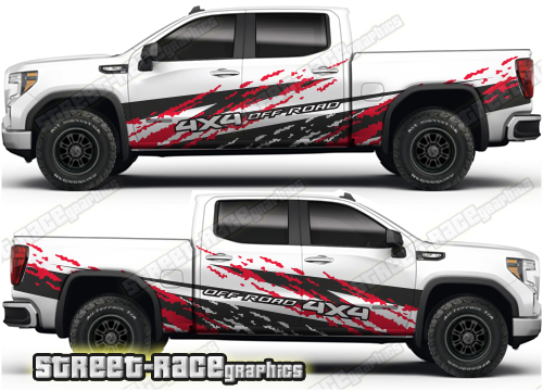 GMC Sierra large graphics. They are shown on the 4th generation dual cab 1500 GMC Sierra, but they can be trimmed to fit all earlier versions and facelift variants. The decals do not have any door handle cutouts, wheel arch or door line splits. These will require trimming during fitting. Vinyl will not stick to unpainted textured plastics.