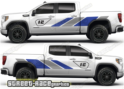 GMC Sierra large graphics. They are shown on the 4th generation dual cab 1500 GMC Sierra, but they can be trimmed to fit all earlier versions and facelift variants. The decals do not have any door handle cutouts, wheel arch or door line splits. These will require trimming during fitting. Vinyl will not stick to unpainted textured plastics.