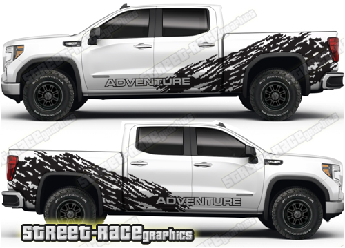 GMC Sierra large graphics. They are shown on the 4th generation dual cab 1500 GMC Sierra, but they can be trimmed to fit all earlier versions and facelift variants. The decals do not have any door handle cutouts, wheel arch or door line splits. These will require trimming during fitting. Vinyl will not stick to unpainted textured plastics.