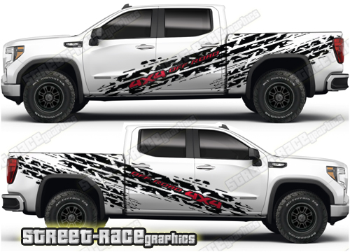GMC Sierra large graphics. They are shown on the 4th generation dual cab 1500 GMC Sierra, but they can be trimmed to fit all earlier versions and facelift variants. The decals do not have any door handle cutouts, wheel arch or door line splits. These will require trimming during fitting. Vinyl will not stick to unpainted textured plastics.