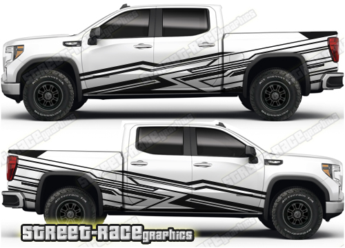 GMC Sierra large graphics. They are shown on the 4th generation dual cab 1500 GMC Sierra, but they can be trimmed to fit all earlier versions and facelift variants. The decals do not have any door handle cutouts, wheel arch or door line splits. These will require trimming during fitting. Vinyl will not stick to unpainted textured plastics.