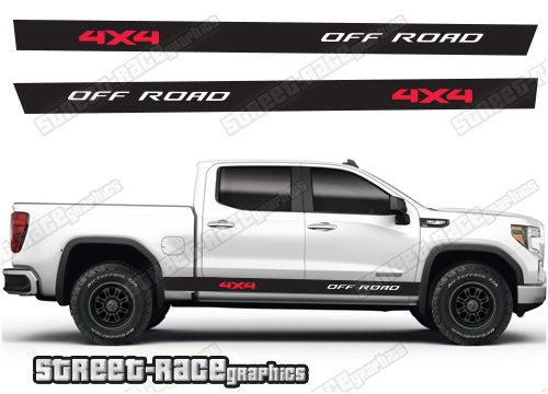 GMC Sierra racing stripes. They are shown on the 4th generation dual cab 1500 GMC Sierra, but they can be made / trimmed fit all earlier versions and facelift variants. The decals do not have any door handle cutouts, wheel arch or door line splits. These will require trimming during fitting. Vinyl will not stick to unpainted textured plastics.