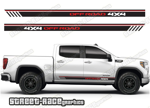 GMC Sierra racing stripes. They are shown on the 4th generation dual cab 1500 GMC Sierra, but they can be made / trimmed fit all earlier versions and facelift variants. The decals do not have any door handle cutouts, wheel arch or door line splits. These will require trimming during fitting. Vinyl will not stick to unpainted textured plastics.