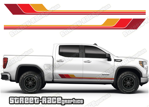 GMC Sierra racing stripes. They are shown on the 4th generation dual cab 1500 GMC Sierra, but they can be trimmed to fit all earlier versions and facelift variants. The decals do not have any door handle cutouts, wheel arch or door line splits. These will require trimming during fitting. Vinyl will not stick to unpainted textured plastics.