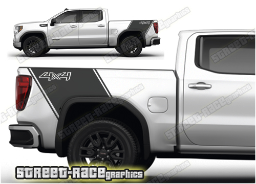 GMC Sierra off-road 4×4 tub stickers. This sticker kit will fit all GMC Sierra + facelift variants. To enable universal fit to all GMC Sierra trucks, the graphic is larger than required – the excess vinyl is simply trimmed off during fitting where it wraps around or butts up to the wheel arch and rear light.