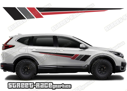 Honda CR-V racing stripes. They are shown on the fifth generation CR-V but they can be trimmed to fit all earlier and later versions and facelift variants. The decals are not pre-cut for any specific Honda CR-V version; they do not have any door handle cutouts, wheel arch or door line splits. These will require trimming during fitting. Vinyl will not stick to unpainted textured plastics.