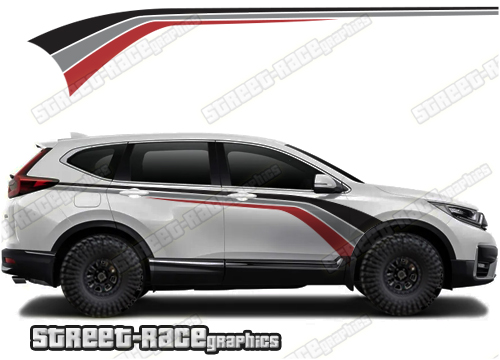 Honda CR-V racing stripes. They are shown on the fifth generation CR-V but they can be trimmed to fit all earlier and later versions and facelift variants. The decals are not pre-cut for any specific Honda CR-V version; they do not have any door handle cutouts, wheel arch or door line splits. These will require trimming during fitting. Vinyl will not stick to unpainted textured plastics.
