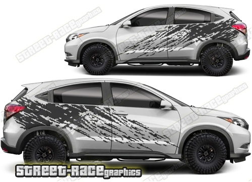 Honda HR-V graphics. They are shown on the second generation HR-V but they can be trimmed to fit all later versions and facelift variants. The decals are not pre-cut for any specific Honda HR-V version; they do not have any door handle cutouts, wheel arch or door line splits. These will require trimming during fitting. Vinyl will not stick to unpainted textured plastics.